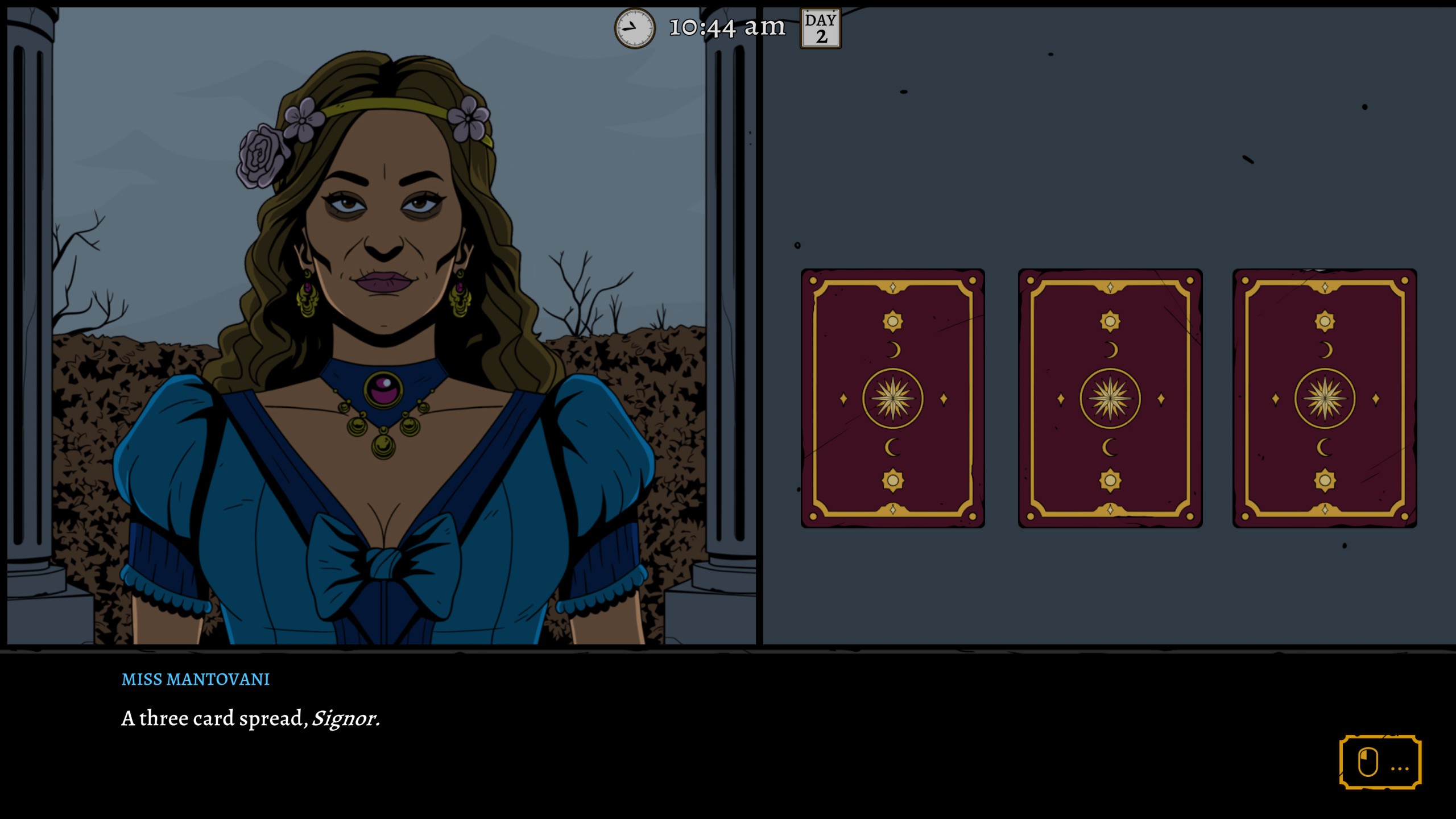 The latest entrant into the booming genre of deduction games, The Séance of Blake Manor comes to us from Ireland, and boy is it about Ireland. Playing as the devout Declan Ward in 1897, you’re sent discreetly to investigate the disappearance of a young woman named Evelyn Deane on the grounds of the titular Blake Manor; on the night of your arrival, you discover the manor is about to host a Grand Séance on Samhain, or All Hallow’s Eve, and a great many interesting characters from around the world are lodged here in hopes of attending the main event.