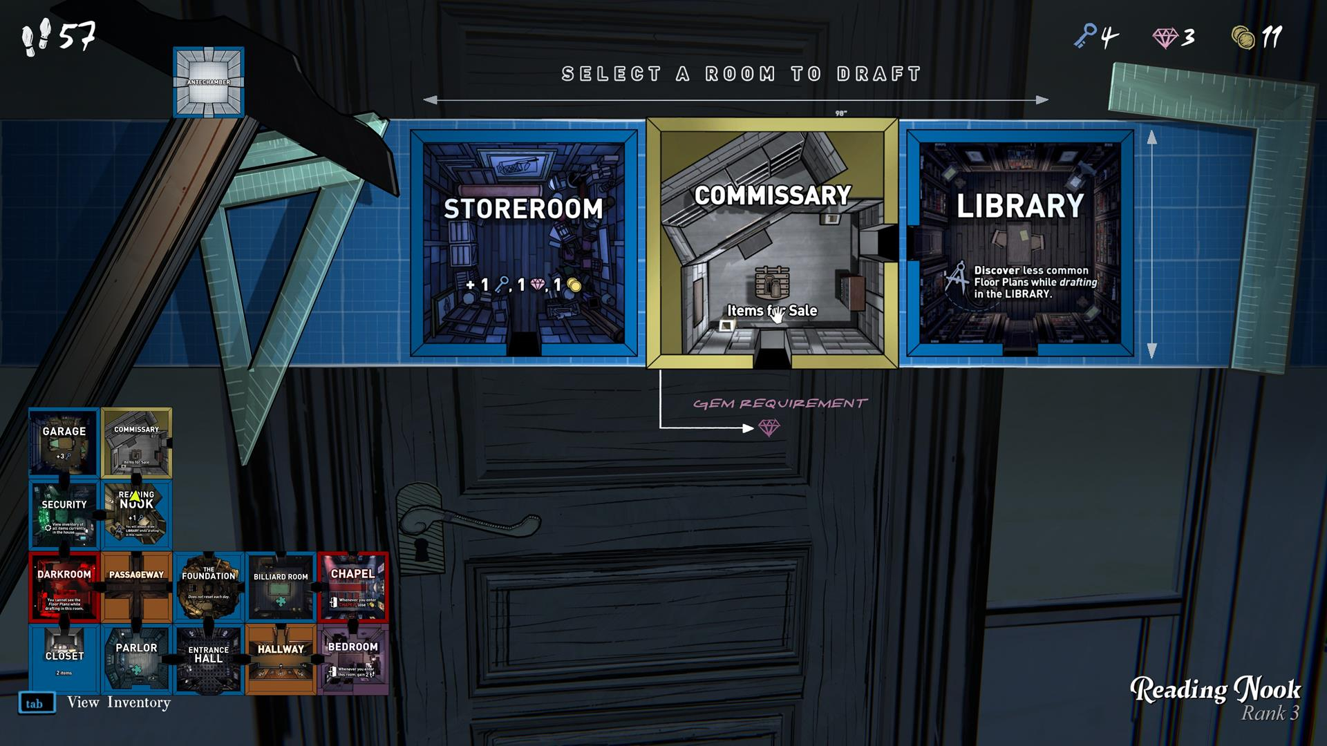 After you run out of Steps, or can no longer draft Rooms which might progress you towards Room 46, it becomes a roguelike—you begin the next day outside the Foyer once again, only this time, the Rooms you drafted are no longer in the same place, and you must draft them all over again. Though this time, you’ll surely do it better than last.