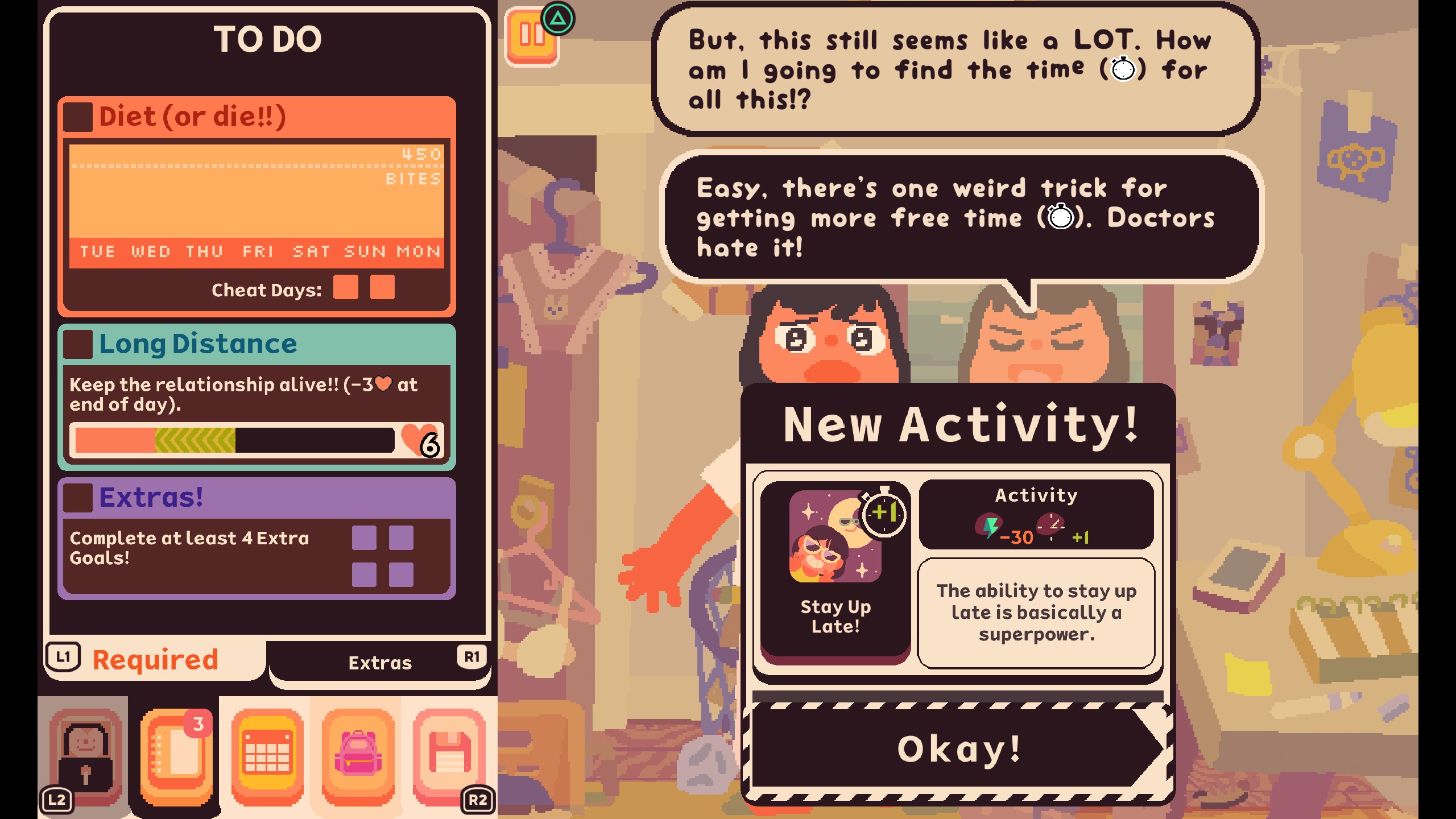 In it, you play as Jenny, a high-school student struggling with dieting, staying on top of schoolwork, chores, and various other things. The game is played as a series of days marked on the calendar before a major milestone or goal: for instance, maybe you have to read a book for a certain class, or save up enough money to go on a date, or what-have-you. Each day, you spend your precious Time (chunked into full integers: you have 2 Time to spend each day, and activities can take anywhere between 0 and 2 Time) to accomplish your goals while also managing your Mood, your Energy, and your Hunger.
